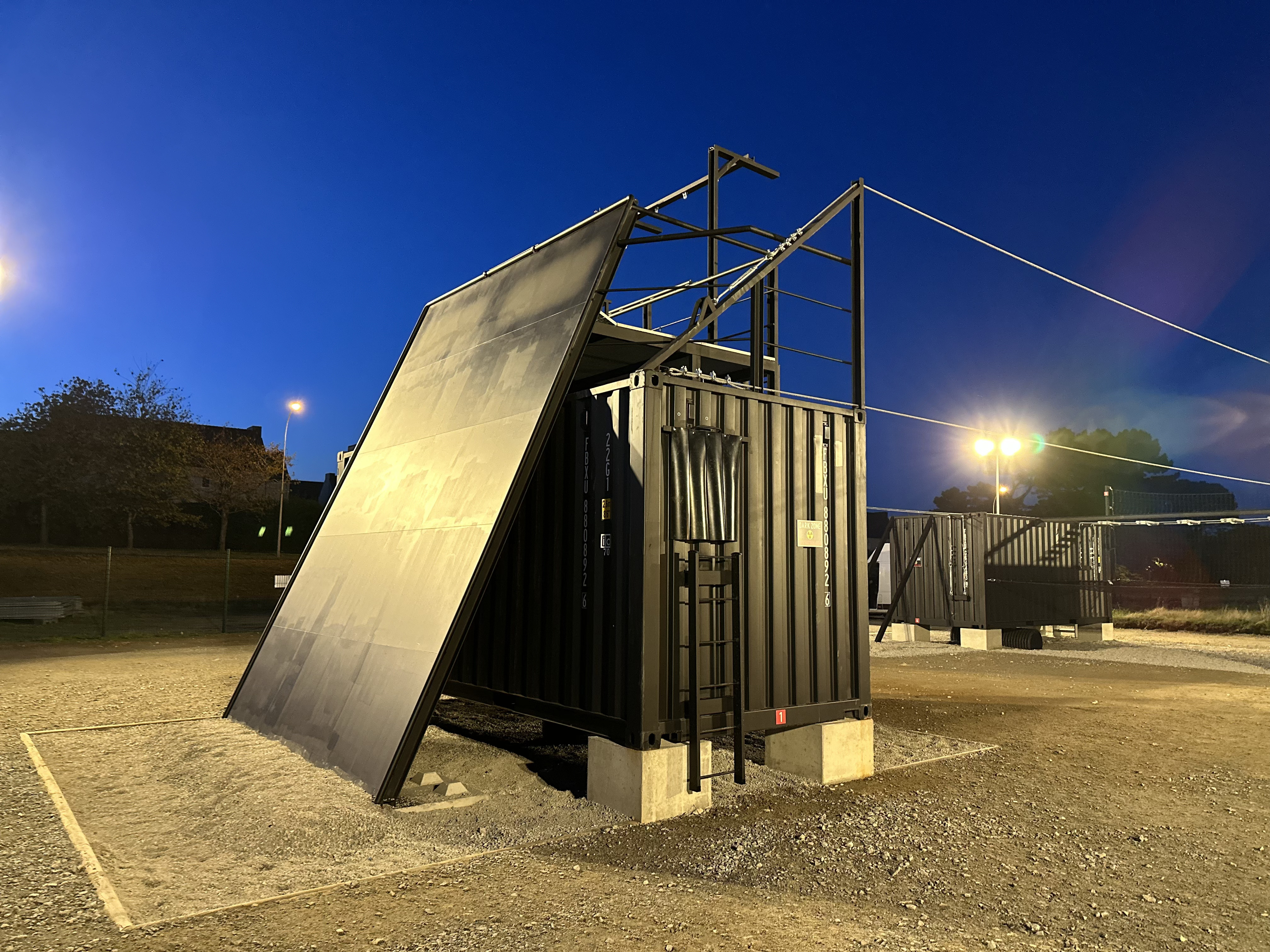 Utilisation de containers maritimes type KC 20 comme base support où sont confectionnés les obstacles par assemblage/soudage de pièces métalliques et de câbles.